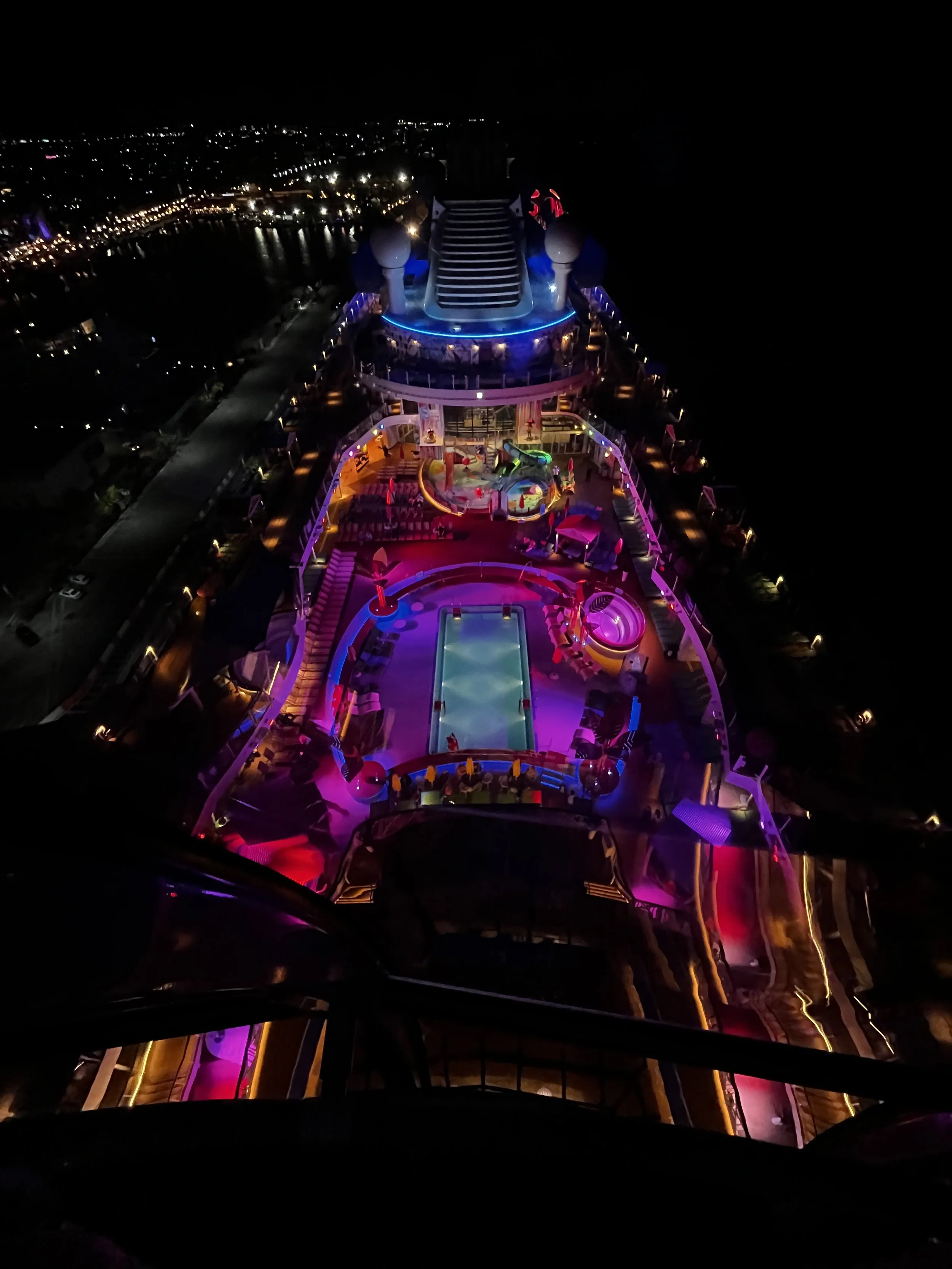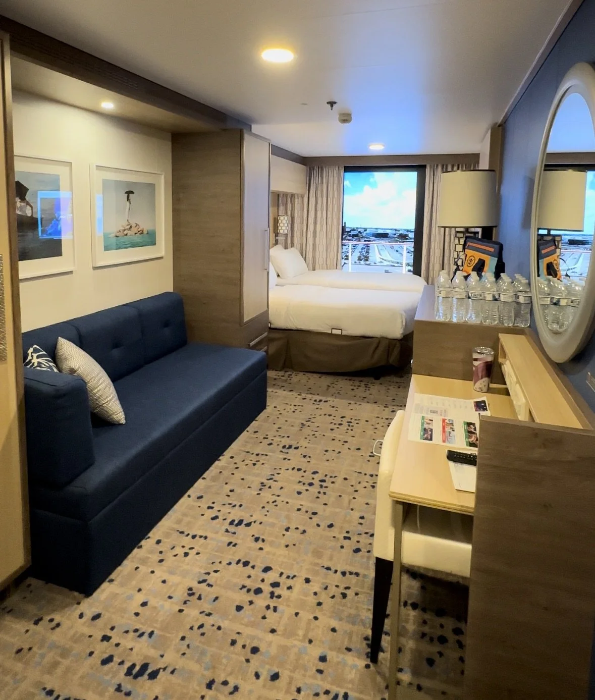 Like any other Royal Caribbean ship, you can choose between an interior, an ocean view, a balcony or a suite. But there are options within each stateroom type to give you even more options. We chose an interior — but with a virtual balcony! This allows for natural daylight that you don’t get in an interior, at a fraction of the cost of an actual balcony. We felt like it was a game-changer for interior rooms! We will definitely book another virtual balcony room in the future. We also always bring this TROND which gives you so many extra outlets!
